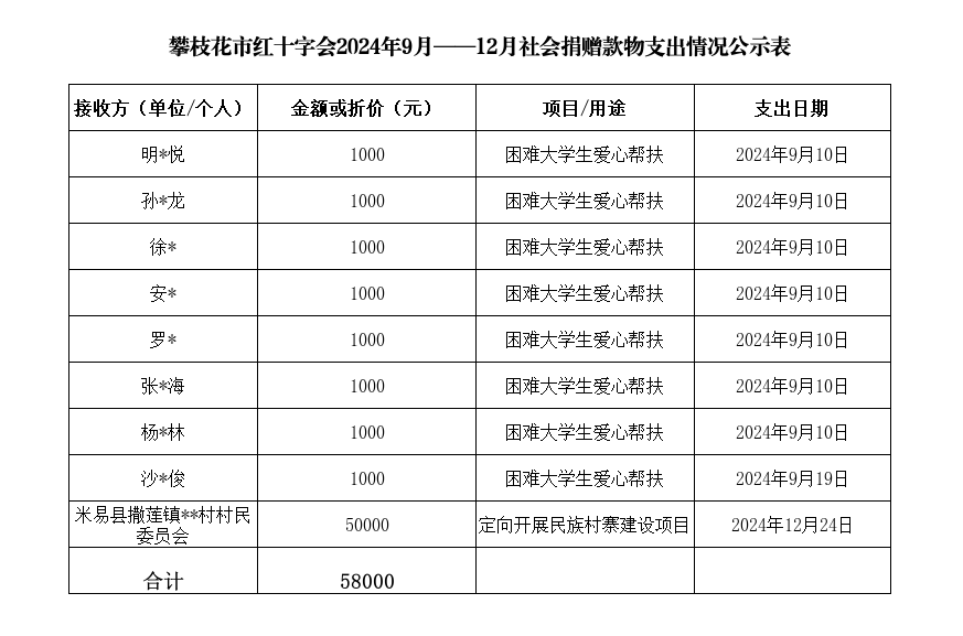 攀枝花市红十字会2024年9月——12月社会捐赠款物支出情况公示