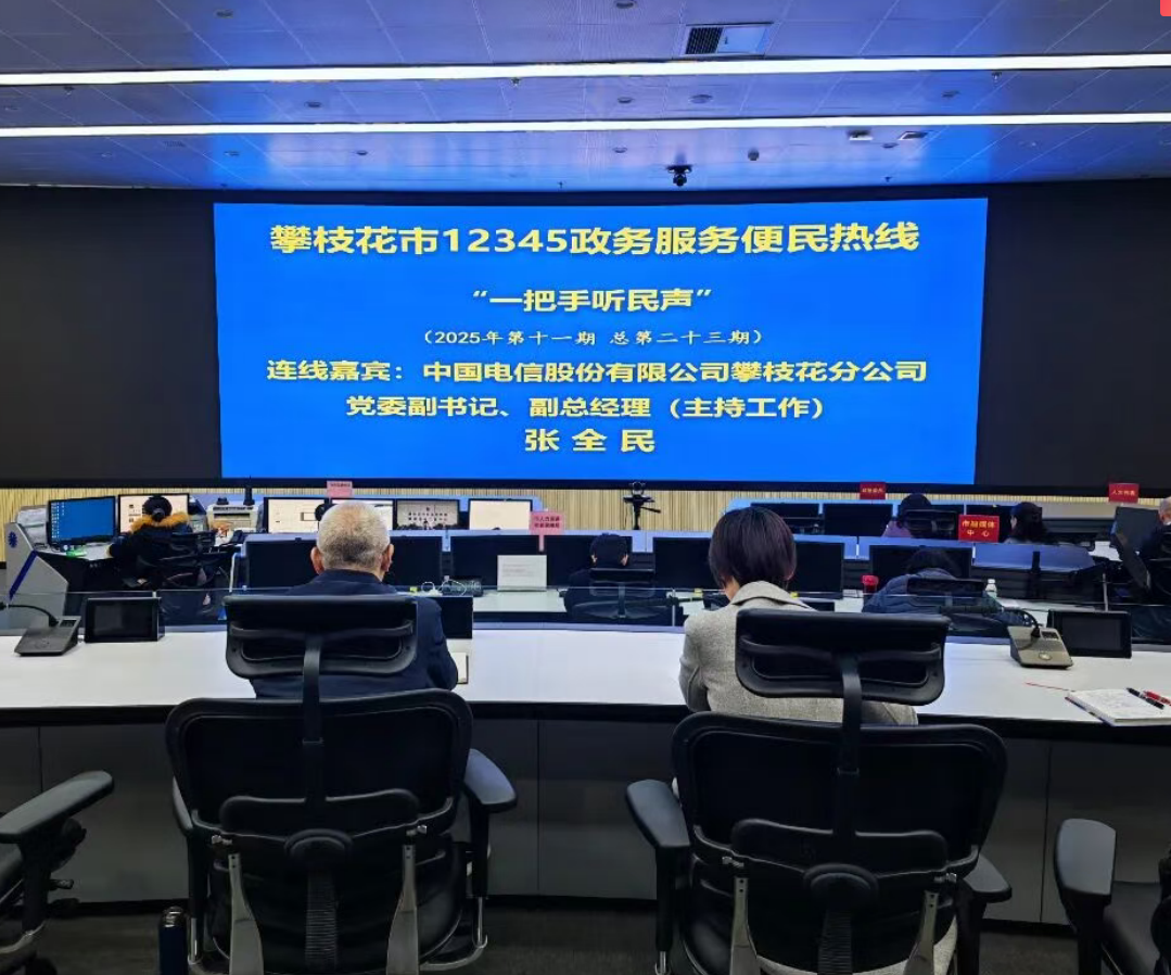 11月25日上午,我市开展2025年第十一期“一把手听民声”活动,中国电信股份有限公司攀枝花分公司党委副书记、副总经理张全民,走进攀枝花市12345群众服务中心,上线接听12345政务服务便民热线,了解群众诉求,就大家所关注的网络信号、套餐资费、有线宽带等问题进行细致解答。