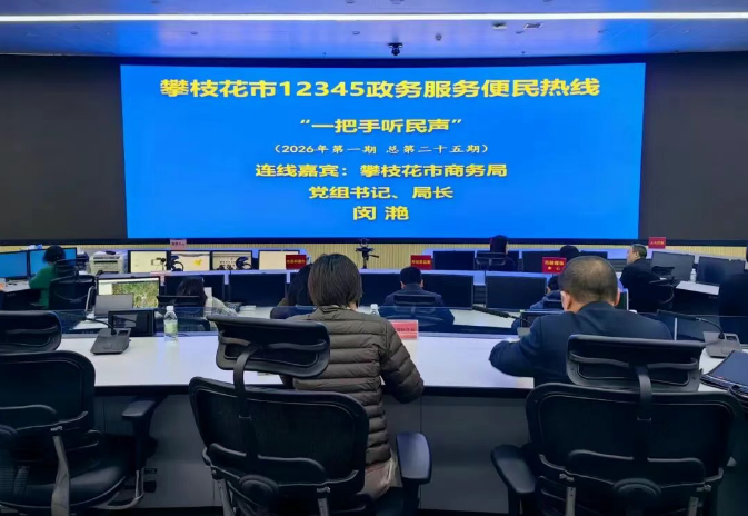 1月6日上午,我市开展2026年第一期“一把手”听民声活动,攀枝花市商务局党组书记、局长闵滟走进攀枝花市12345群众服务中心,上线接听12345政务服务便民热线,与市民进行“零距离”接触,了解群众诉求,就大家所关注的我市商贸流通、服务业发展等领域问题进行细致解答。