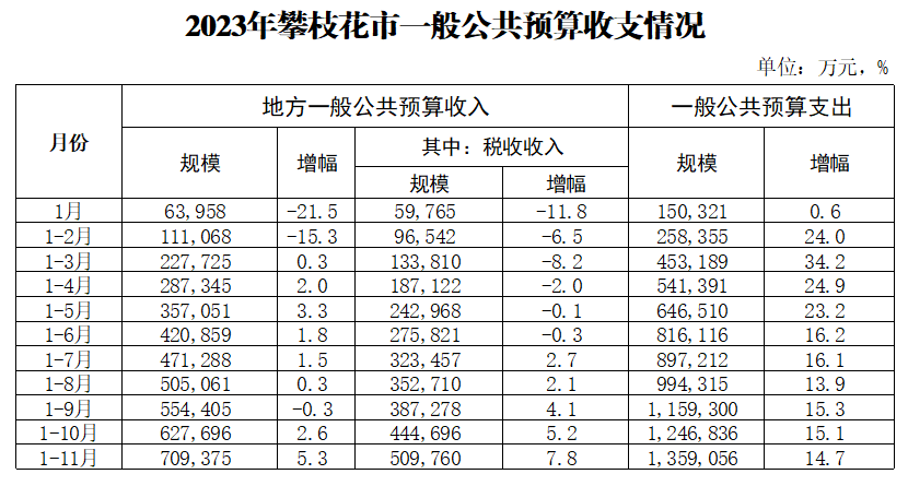 2023年攀枝花市一般公共预算收支情况(按月)