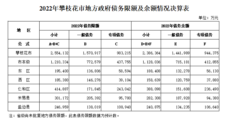 2022年攀枝花市地方政府债务限额及余额情况决算表