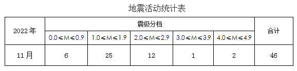 2022年11月,攀枝花市地震监测中心共监测到本市及周边地区地震46次,其中最大地震为11月16日10时46分四川会理(北纬26.46°,东经102.04°)4.3级,震源深度16公里,震中距离我市中心约37公里,距离盐边县红格镇约14公里,全市有明显震感。