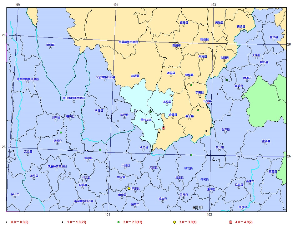 本月我市境内记录6次地震,其中盐边县红果乡5次,新九镇1次,最大地震为11月5日8时43分红果乡1.9级,震源深度10公里,震中距离市中心约24公里。