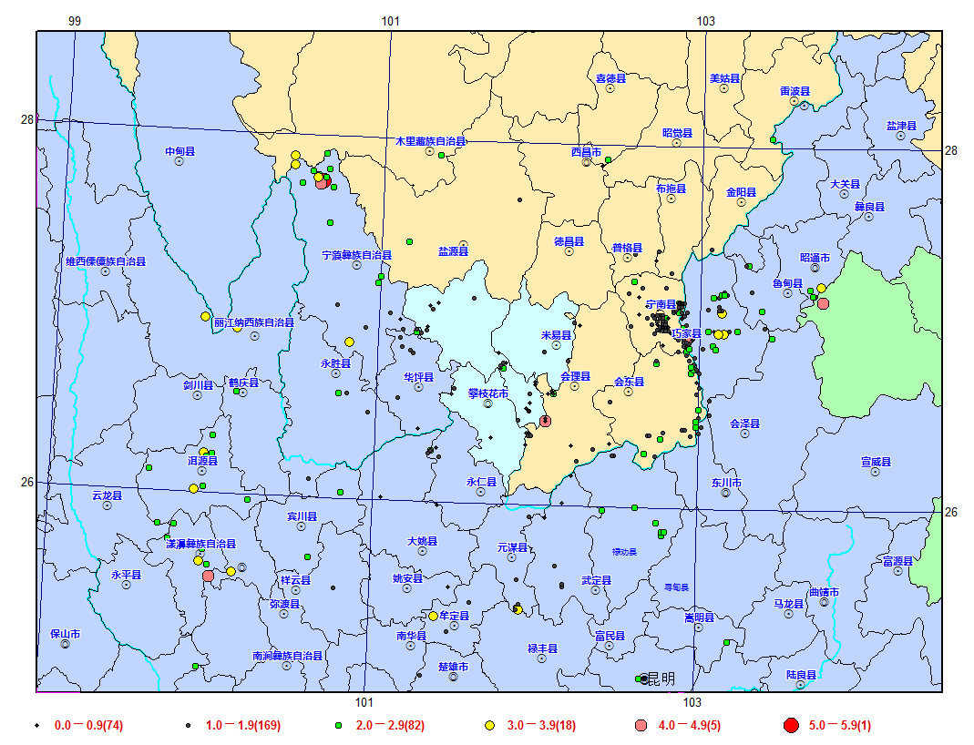 本年度我市境内共发生37次地震,其中0.0-0.9级23次,1.0-1.9级14次,震中主要分布在盐边县格萨拉乡、红果乡、新九镇、红格镇、仁和区大龙潭乡,最大地震为3月3日00时13分盐边县红格镇发生的1.9级地震,震源深度10公里,震中距离我市中心约25公里。