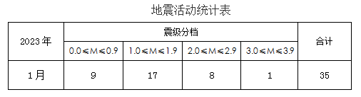 2023年1月,攀枝花市地震监测中心共监测到本市及周边地区(北纬:25.5°-28.0°,东经:99.5°-103.5°)地震35次,其中最大地震为1月12日14时15分四川宁南(北纬27.11°,东经102.89°)3.0级,震源深度10公里,震中距离我市中心约134公里。