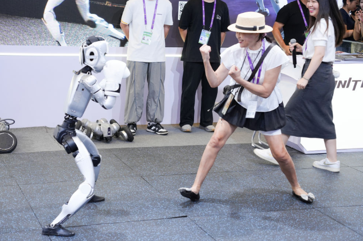 2025年9月19日,在第22届中国—东盟博览会上的人工智能专馆里,一台人形机器人表演“拳击”,与观众互动。新华社记者 周汀鹭 摄