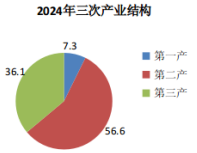 根据地区生产总值统一核算初步结果,2024年攀枝花市地区生产总值(GDP)1395.24亿元,按可比价格计算,比上年增长6.3%。其中,第一产业增加值102.14亿元,增长3.6%,对经济增长的贡献率为4.7%,拉动经济增长0.3个百分点;第二产业增加值790.14亿元,增长6.4%,对经济增长的贡献率为56.9%,拉动经济增长3.6个百分点;第三产业增加值502.95亿元,增长6.8%,对经济增长的贡献率为38.4%,拉动经济增长2.4个百分点。三次产业结构由上年的7.6:56.7:35.7调整为7.3:56.6:36.1。全市民营经济增加值711.75亿元,增长7.3%,占GDP的比重为51.0%。