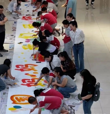 10月1日,49组家庭奔赴攀枝花市图书馆,参加“书香润国庆 花城艺起来”活动。学生与家长在国旗背景墙前合影留念,定格美好瞬间。大家携手完成以《我和我的祖国》为主题的百米长卷,用画笔抒发对祖国的热爱。实验学子齐声高唱《我和我的祖国》,歌声与画卷相映成趣,家国情怀在心中深深扎根。