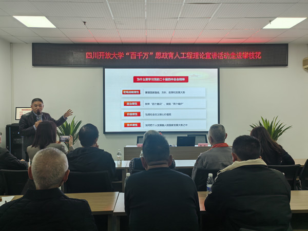 12月8日下午,攀枝花开放大学积极响应四川开放大学“百千万”思政育人工程部署要求,特邀四川开放大学马克思主义学院杨波教授,赴攀枝花市东区炳草岗街道紫荆山社区开展党的二十届四中全会精神主题宣讲活动。活动由攀枝花开放大学党委书记、校长宋玉霞主持,紫荆山社区党员干部、居民代表及攀枝花开放大学第二党支部全体党员参加。