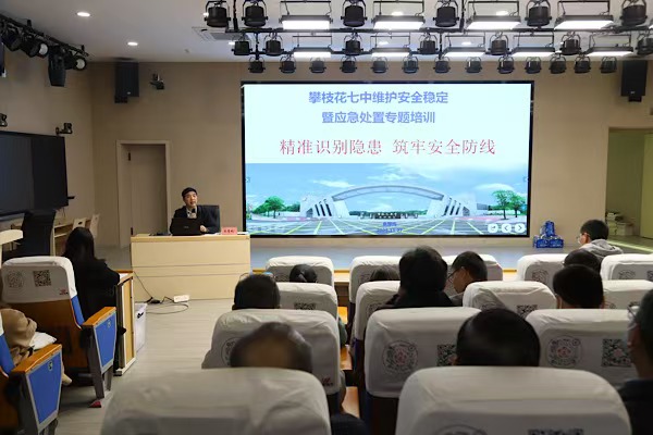 近日,攀枝花市第七高级中学校召开校园安全稳定暨应急处置培训会议。花城校区会议由校党委书记杨鸿主持,西城校区会议由校党委副书记、校长李刚主持,全体教职工参会。