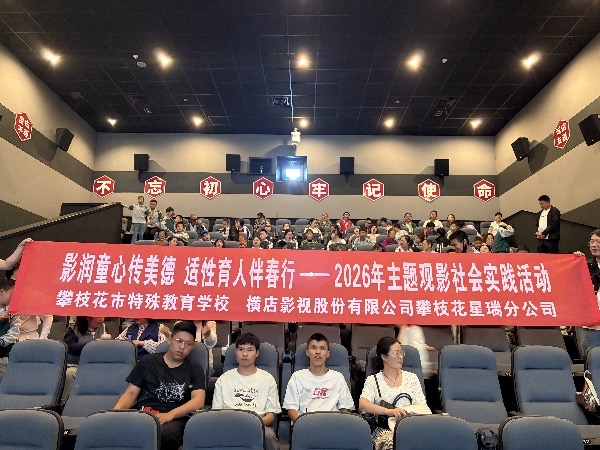 春和景明,春假将至。为丰富特殊学生精神文化生活,落实“适性德育”理念,3月31日上午,攀枝花市特殊教育学校联合横店影视股份有限公司攀枝花星瑞分公司,组织全体盲、聋、培智学生及家长150余人,走进西区横店影城开展主题社会实践活动,让孩子们在趣味观影中收获成长,欢乐迎接春假。