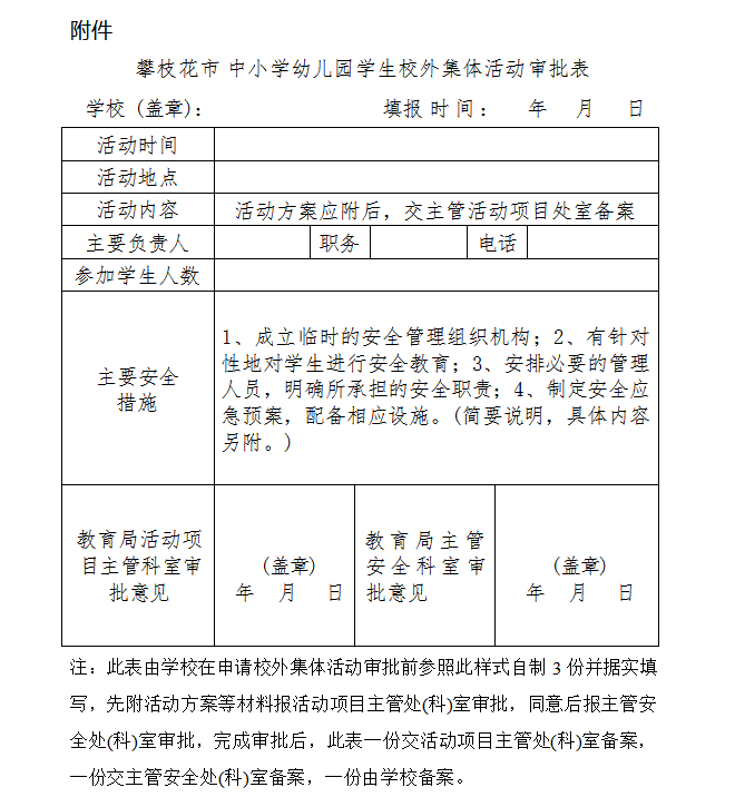 (1)《攀枝花市中小学幼儿园学生校外集体活动审批表》(由 各教育行政部门自行定制,样表附后)一式三份,一份交活动主 管处(科)室审批备案,一份交主管安全处(科)室审批备案,一份 学校备案;