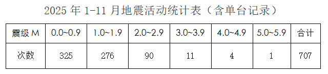 2025年1-11月地震活动统计表及多台定位震中分布图如下所示: