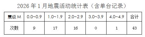 2026年1月地震活动统计表及多台定位震中分布图如下所示: