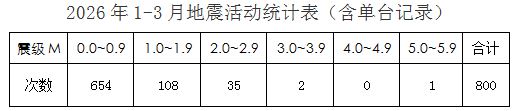2026年1-3月地震活动统计表及多台定位震中分布图如下所示:
