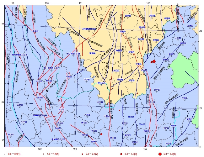2020年5月,攀枝花市地震监测中心监测到我市及周边地区地震17次,最大地震为18日21时47分在云南巧家(北纬27.18度,东经103.16度)发生的5.0级地震,震源深度8公里,震中距离攀枝花市区约160公里,我市部分市民有感,截止6月1日00时,共监测到巧家5.0级地震的余震6次,最大余震为19日04时35分发生的3.5级地震。责任区内发生2次地震,具体为:5月4日16时31分在攀枝花市盐边县南部与凉山州会理县交界(北纬26.47度,东经102.01度)发生1.2级地震,震中距离盐边县红格镇18公里。5月22日20时32分在凉山州会理县与攀枝花市仁和区东南部交界(北纬26.36度,东经101.95度)发生1.3级地震,震中距离仁和区大龙潭乡7公里。本月我市及周边地区地震活动震中分布如下图所示: