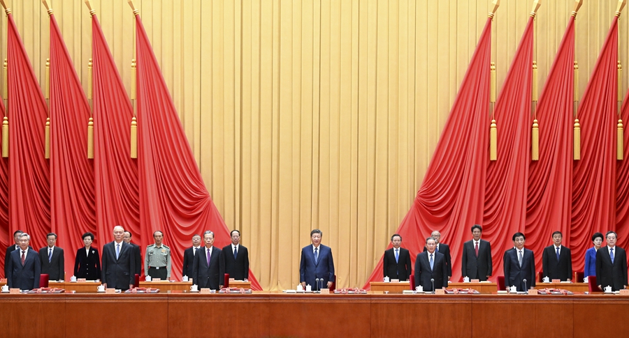 李强主持大会,王沪宁宣读表彰决定,赵乐际、蔡奇、丁薛祥、李希出席。