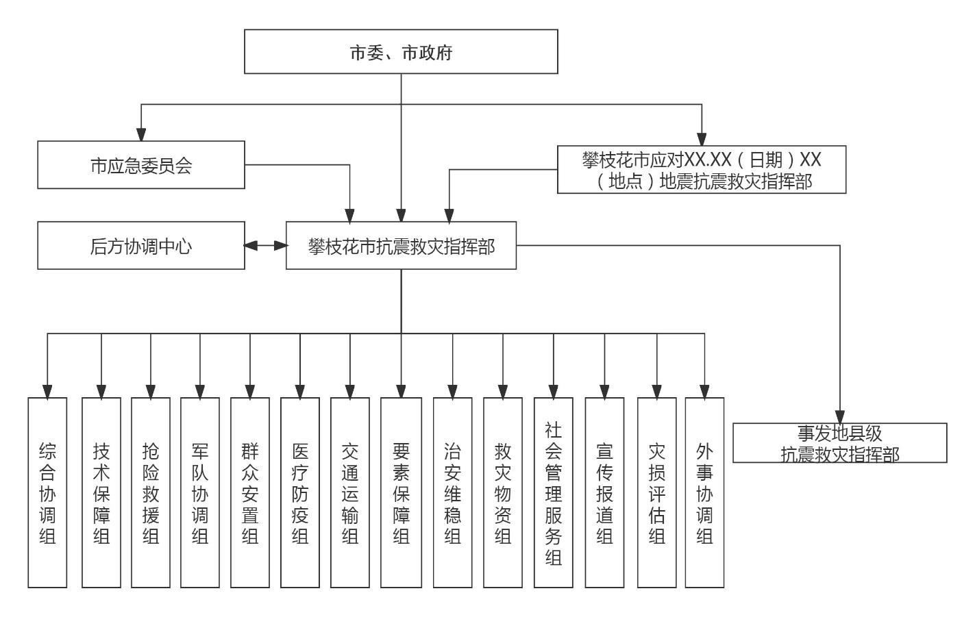 由市应急管理局牵头,市委宣传部、市发展改革委、市经济和信息化局、市公安局、市交通运输局、市住房城乡建设局、市卫生健康委、市外事办、攀枝花军分区和灾区县(区)人民政府等组成。