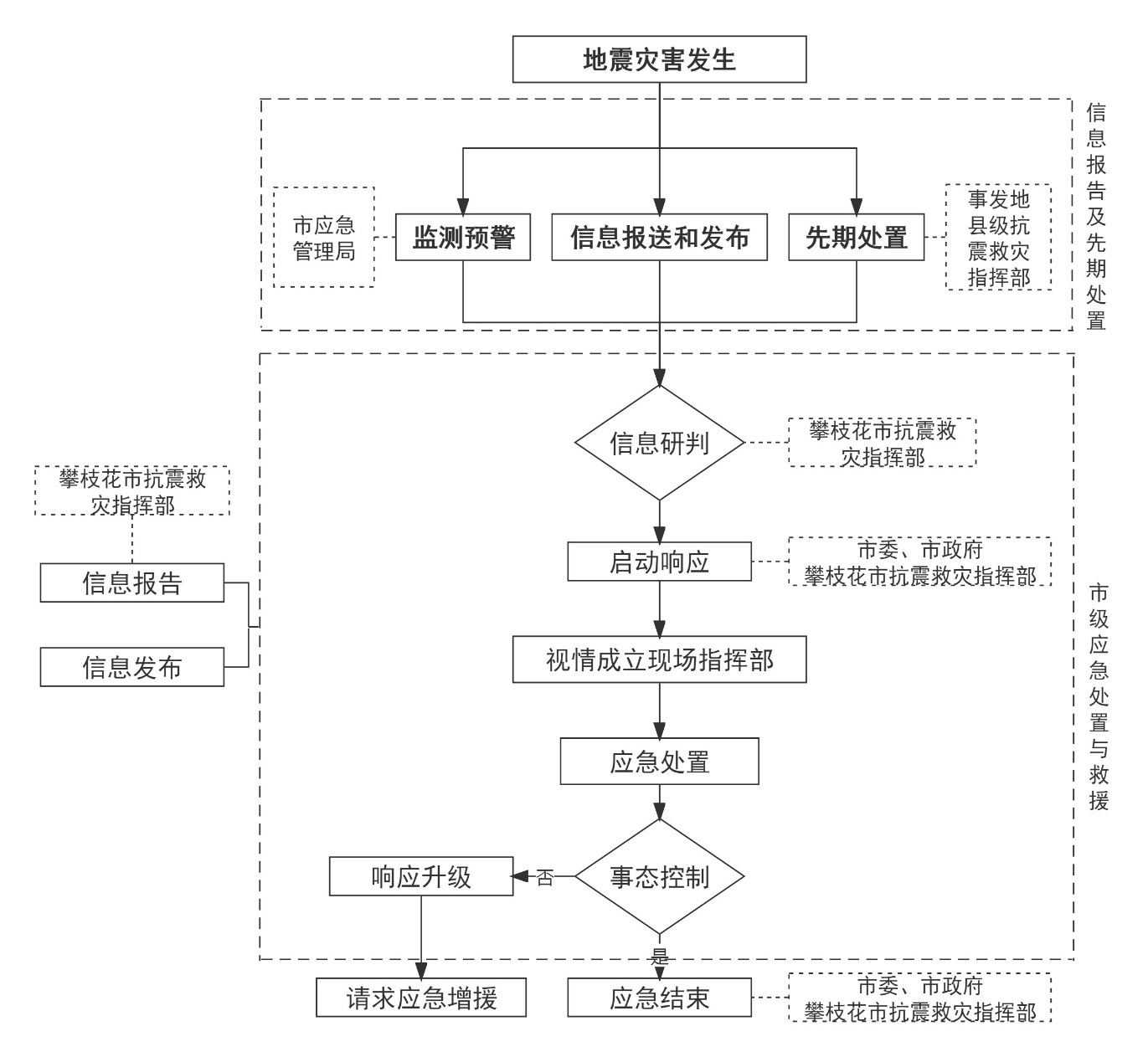 省地震局攀枝花地震监测中心站:负责配合组建技术保障组;协同开展震情速报、现场地震监测、震情跟踪和地震趋势判定,对地震灾情进行快速评估;协同开展地震灾害调查,参与地震灾害损失评估;配合发布抗震救灾信息;完成市抗震救灾指挥部交办的其他任务。