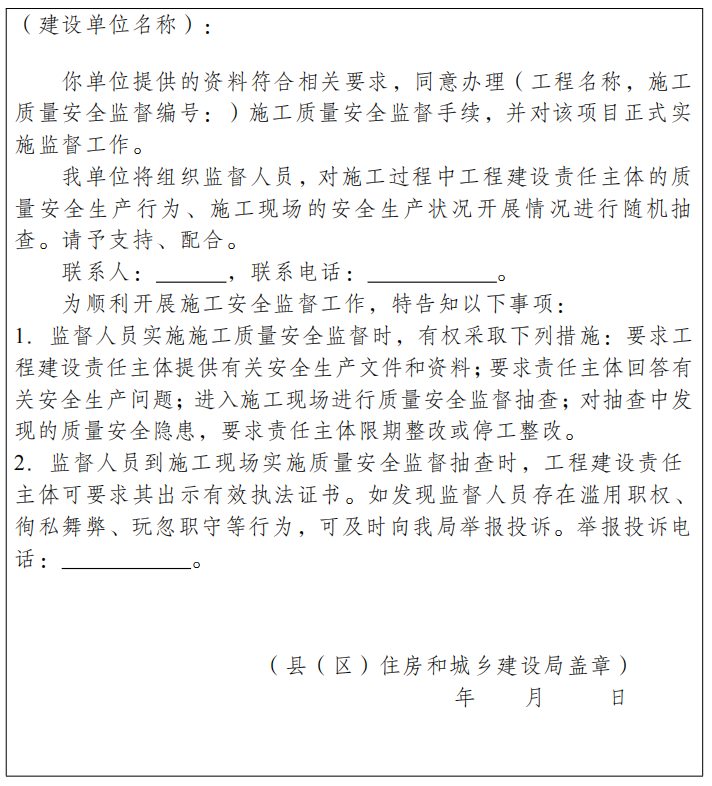 施工质量安全监督告知书