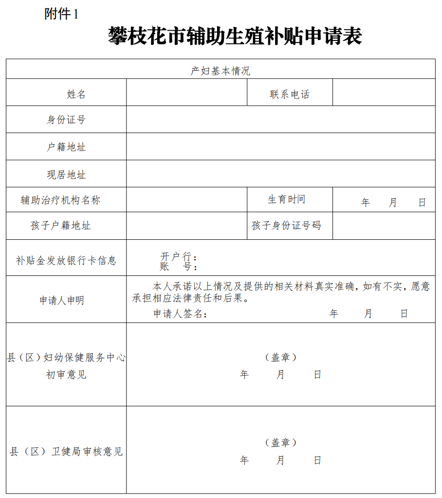 (一)《攀枝花市辅助生殖补贴申请表》(附件1)。