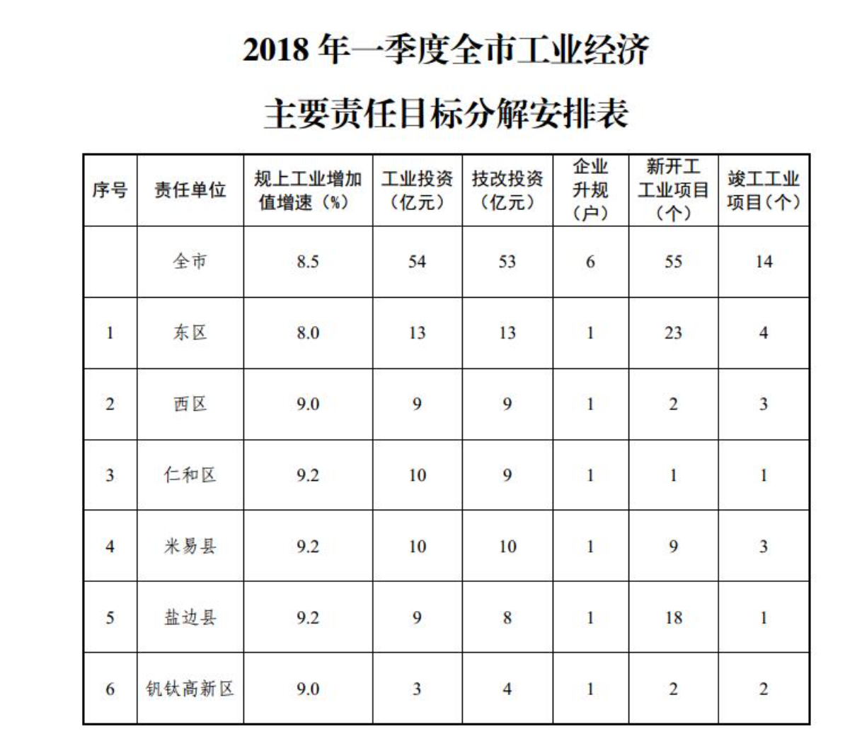 2018 年一季度,全市工业主要经济指标按“两个不低于、两个高于”安排,即各县(区)、钒钛高新区规模以上工业增加值增速不低于全年目标,不低于全市平均水平;工业投资和技改投资要高于省上下达的目标、高于市政府下达的预期目标。全市一季度规模以上工业增加值增速达 8.5%以上,工业投资和技改投资分别完成 54 亿元和 53 亿元以上,新开工工业项目达到 55 个、竣工工业项目达到 14 个,新升规企业 6 户。