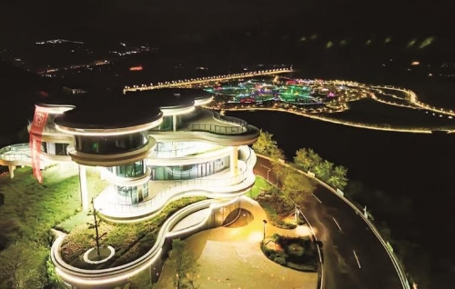 图为位于机场路的“花之眼”建筑。夜幕下,“花之眼”与阿署达四季花海景区交相辉映。(东区融媒体中心供图)