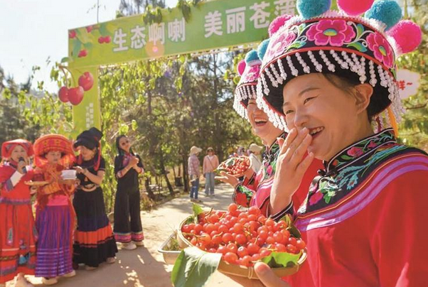 村口,拦门酒香伴着迎客歌,村民手捧樱桃和蓝莓,笑意盈盈,让游客未入园心先醉。台上《又见樱桃红》歌声刚落,“抓鸡捉兔”的活动便在场院开展。集市上菌菇飘香、土鸡蛋抢手,村民杨春伦带来的300多斤菌菇半天就售罄,预计收入2000元。一旁的樱桃林里,中华小樱桃、玛瑙红缀满枝头,游客提篮穿梭林间,摘下的是鲜果,留下的是人气。中午时分,50桌坝坝宴沿着樱桃园铺开,营盘火腿、炖羊肉香气四溢,座无虚席。