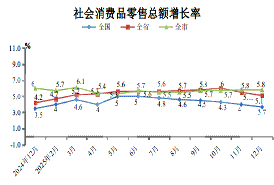 消费市场回暖明显。2025年全市实现社会消费品零售总额388.82亿元、增长5.8%,增速分别高于全国(3.7%)、全省(5.1%)2.1个、0.7个百分点,居全省第14位。开展消费促进活动400余场次,“川超”赛事、金曲传奇演唱会等“票根经济”加快发展,城镇、乡村消费品零售额分别增长5.5%、6.6%。新增王府井等消费新场景40个,商品零售增长5.6%,餐饮收入增长6.6%。以旧换新政策带动通讯器材、汽车销售市场火爆,家电音像类(67.9%)、新能源汽车(37.0%)实现高速增长,消费升级趋势显著。