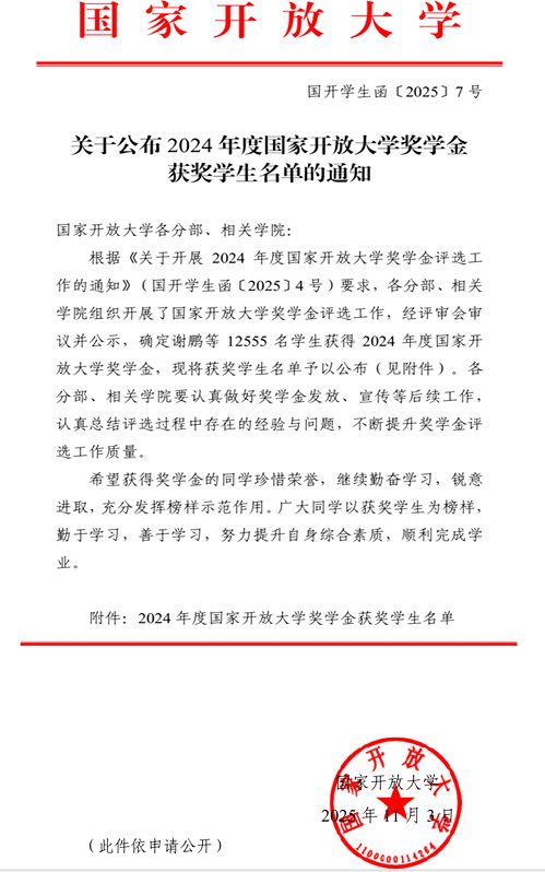 近日,国家开放大学2024年度奖学金及优秀毕业生名单出炉,攀枝花开放大学的16名学员上榜。其中,辜雁等15名同学荣获2024年度国家开放大学奖学金,彭方荣同学获评2024年度“国家开放大学优秀毕业生”荣誉。他们以勤奋为桨,在终身学习的海洋中勇毅前行,取得骄人成绩,彰显攀枝花开放大学教育的丰硕成果。向所有获奖同学表示热烈的祝贺!