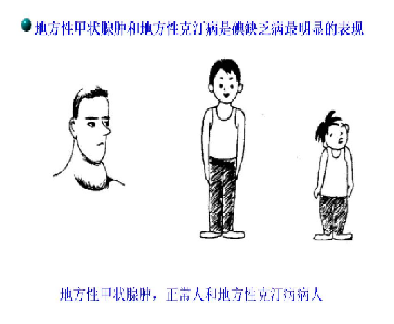 2.地方性甲状腺肿,俗称粗脖根或大脖子病;严重碘缺乏会引发地方性克汀病。表现为聋、哑、呆、傻。