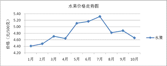 6.水果类价格。我市市场中苹果、脐橙等应季水果大量上市,价格回落,与上月相比水果平均价格下降4.46%。