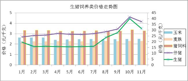 根据对全市农业生产资料价格监测,十一月份攀枝花市农业生产资料价格除猪类价格回落较大外,总体运行平稳。其中生猪部分与上月相比,生猪跌21.65%,仔猪跌9.68%。玉米涨0.40%、猪饲料跌2.98%,麦麸与上月持平。十一月份猪粮比为12.59:1,较上月跌21.96%,受出栏量增加等影响,本月生猪价格仅为短期暂时性回落,受传统节日临近及灌制腌腊制品习惯等影响回落期不会持续太久,预计十二月份猪粮比仍将处于红色区域(价格重度上涨);猪料比为9.61:1,较上月跌19.25%;与去年同期相比,生猪价格涨88.57%,仔猪价格涨106.13%,猪饲料跌2.40%,玉米持平,麦麸跌1.72%;