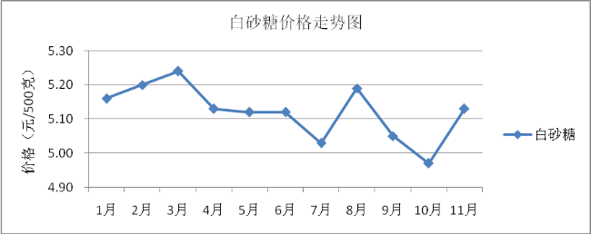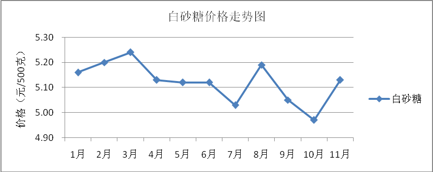 2.食糖类价格。市场供应稳定,价格略有回落。白砂糖平均价格为5.13元/500克,与上月相比涨3.31%,与去年同期相比涨6.82%;