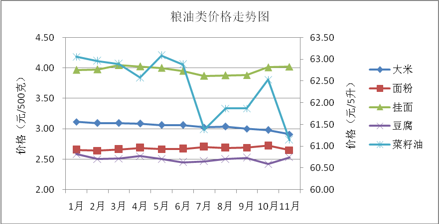 1.粮油类价格。本月货源充足,供需平衡,进价稳定,个别品种受进价、产量、供求等因素影响略有波动。大米平均价格为2.91元/500克,与上月相比跌2.32%;面粉平均价格为2.65元/500克,与上月相比跌2.48%;挂面平均价格为4.02元/500克,与上月相比涨0.15%;豆腐平均价格为2.53元/500克,与上月相比涨4.38%;菜籽油平均价格为61.14元/5升,与上月相比跌2.23%。与去年同期相比,大米跌6.96%,面粉跌0.66%,挂面涨1.07%,豆腐跌3.63%,菜籽油跌3.32%;