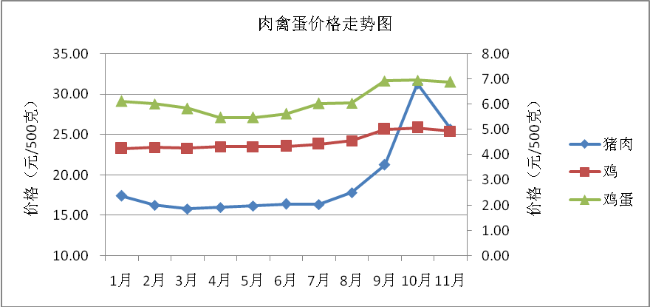 3.肉禽蛋类价格。由于本地生猪出栏数增加,猪肉供应量暂时充足,价格进一步回落。受目前猪肉下降影响,鸡肉、鸡蛋价格也略有下降。据监测,活鸡价格为25.42元/500克,与上月相比跌1.61%。鸡蛋6.88元/500克,与上月相比跌1.15%。本月猪肉平均价格为25.69元/500克,与上月相比,猪肉价格跌15.11%。与去年同期相比,肉禽蛋皆涨,其中猪肉价格大幅上涨58.92%,活鸡价格上涨9.55%,鸡蛋价格涨19.74%;目前生猪出栏数虽有所增加,但后期来源尚不稳定,随着年底市场需求量增加预计后期猪肉价格将略有上涨或保持高位运行。