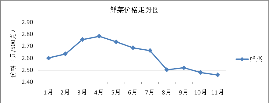 5.鲜菜类价格。蔬菜市场由于供需平衡价格继续保持稳定,个别品种价格受进价、天气、产量影响略有涨跌,但幅度均小。我市监测的11个品种鲜菜价格3涨8跌,综合平均售价与上月相比跌0.68%,与去年同期相比跌11.64%;
