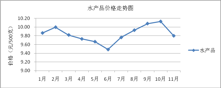 4.水产品类价格。目前平均价格9.80元/500克,与上月相比水产品平均价格跌3.28%,与去年同期相比价格跌2.47%;