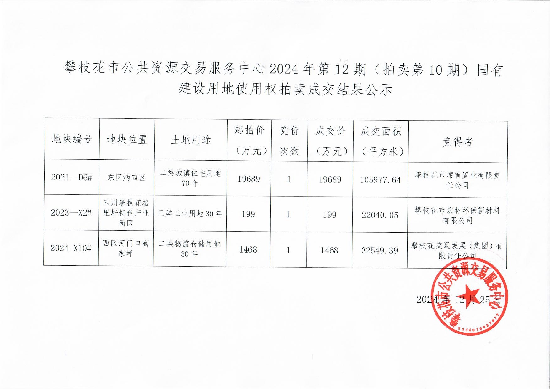 攀枝花市公共资源交易服务中心2024年第12期(拍卖第10期)国有建设用地使用权拍卖成交结果公示