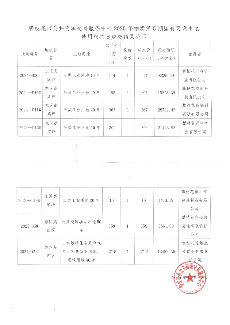 攀枝花市公共资源交易服务中心2025年拍卖第5期国有建设用地使用权拍卖成交结果公示