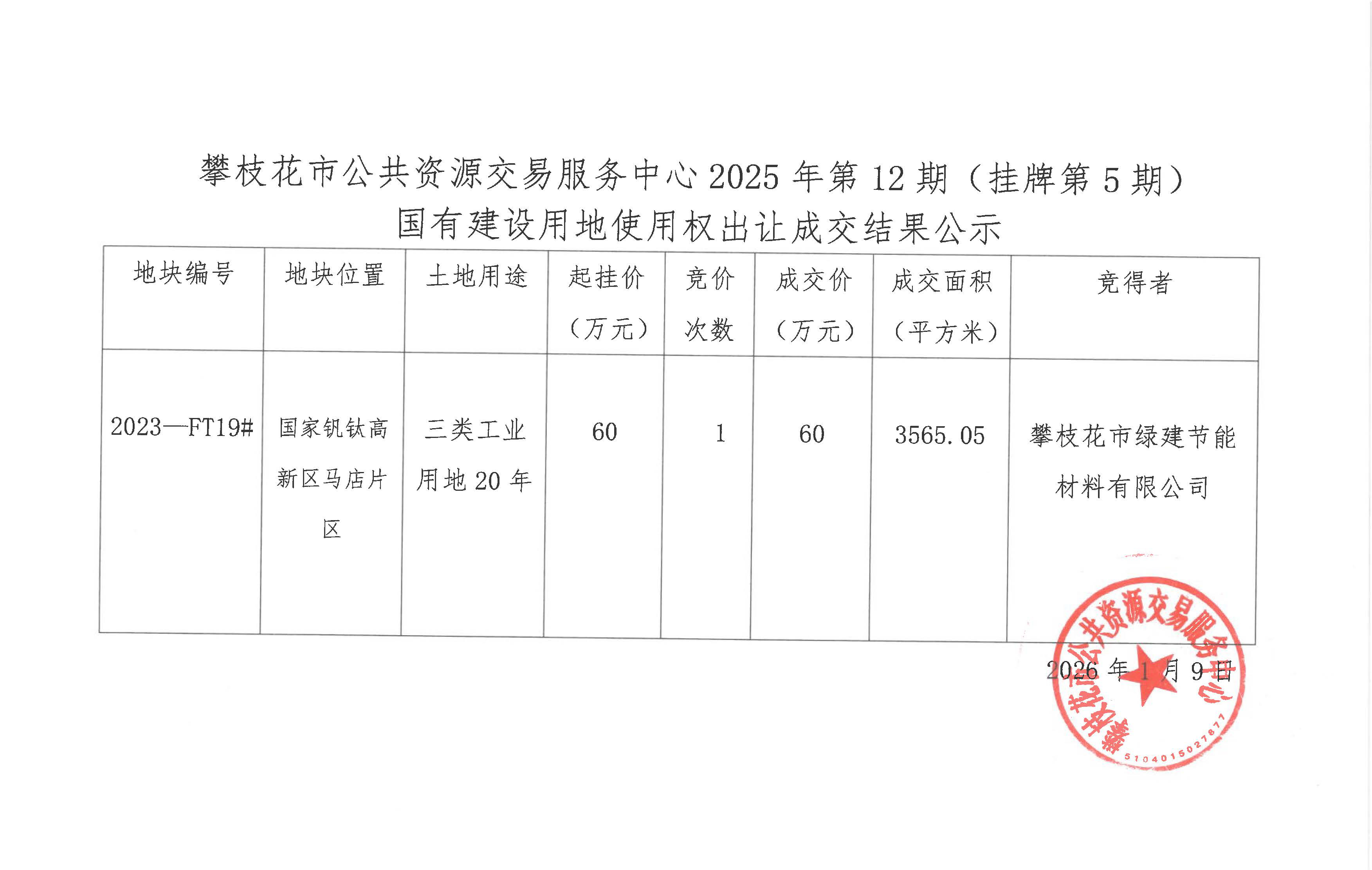 攀枝花市公共资源交易服务中心2025年第12期(挂牌第5期)国有建设用地使用权出让成交结果公示