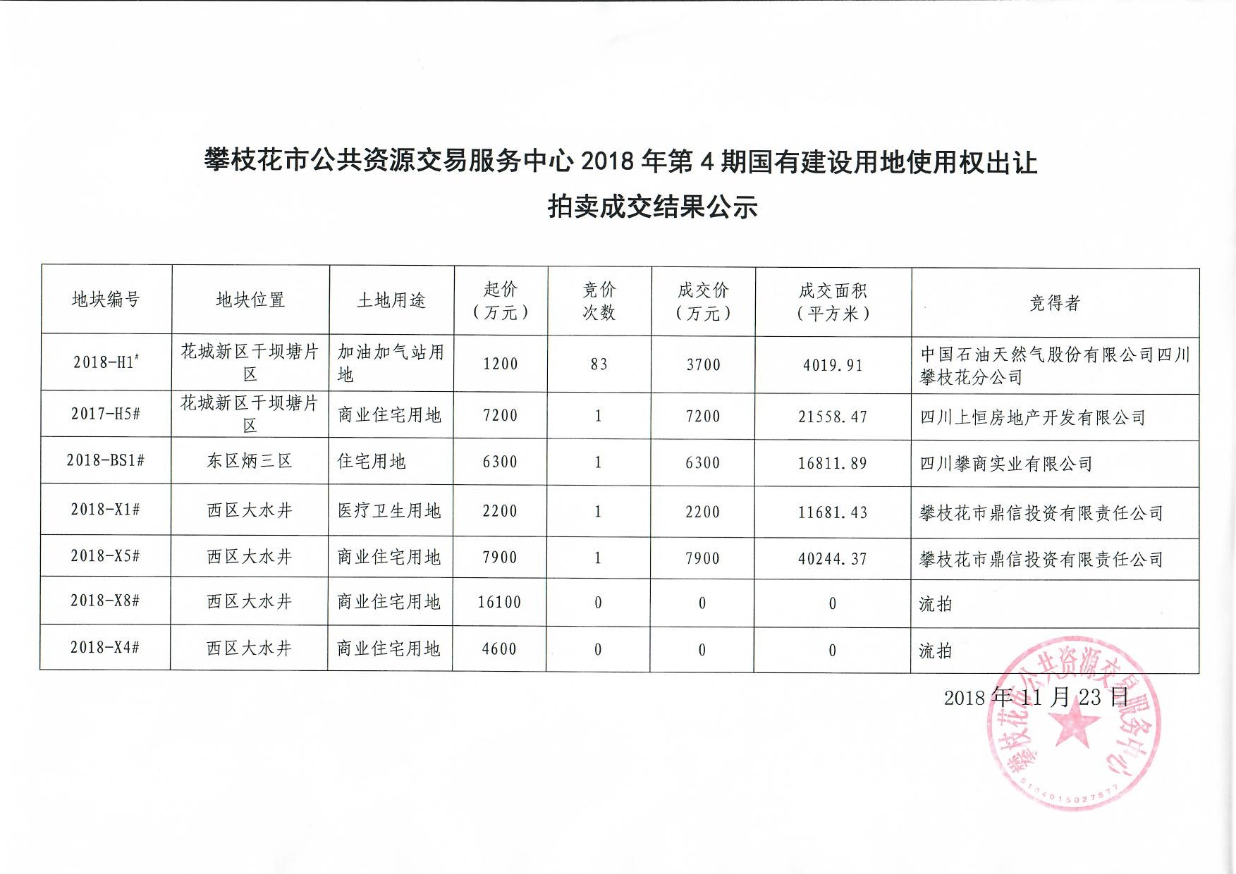 攀枝花市公共资源交易服务中心2018年第4期国有建设用地使用权出让挂牌成交结果公示