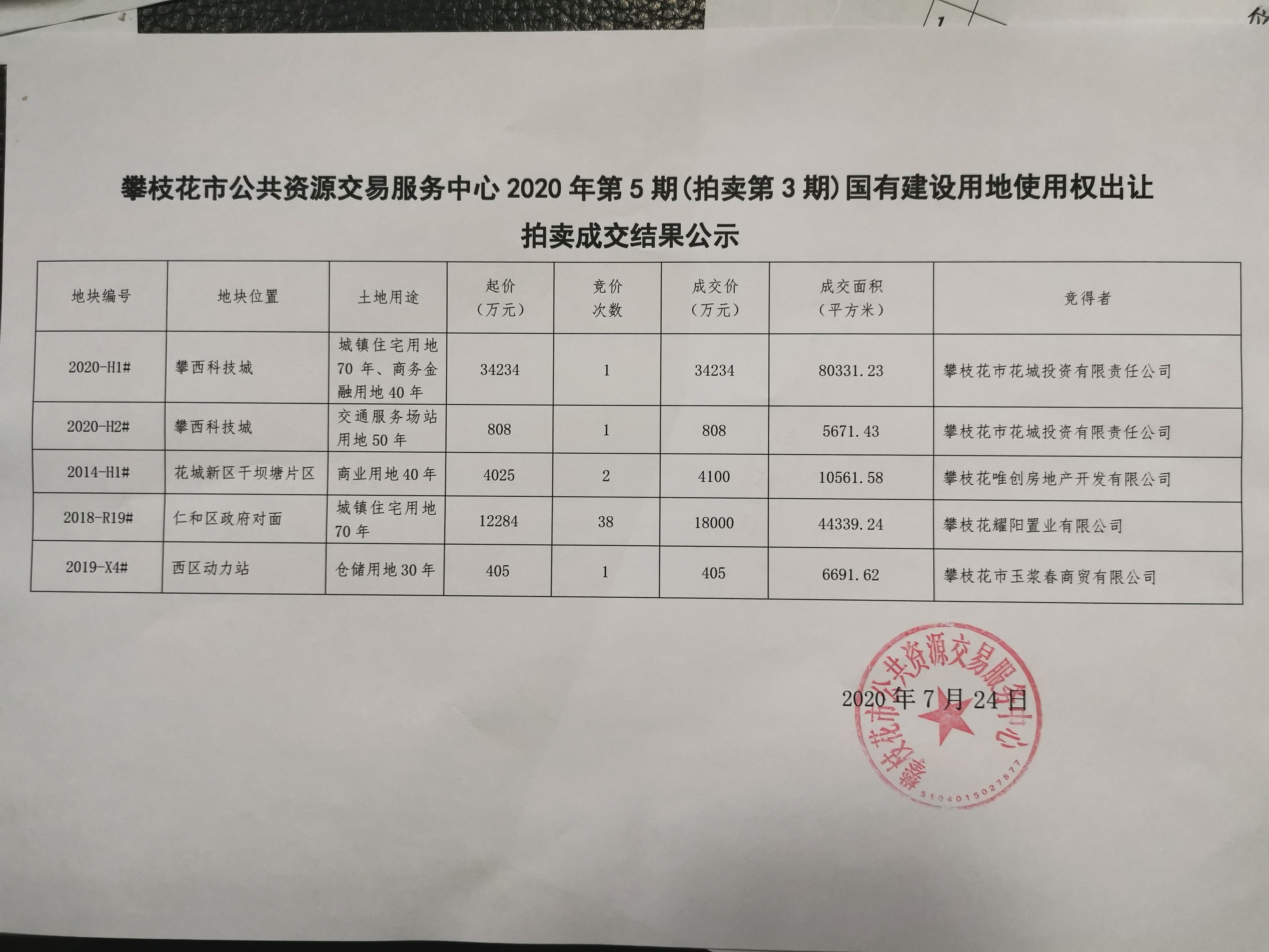 攀枝花市公共资源交易服务中心2020年第5期(拍卖第3期)国有建设用地使用权出让拍卖成交结果公示