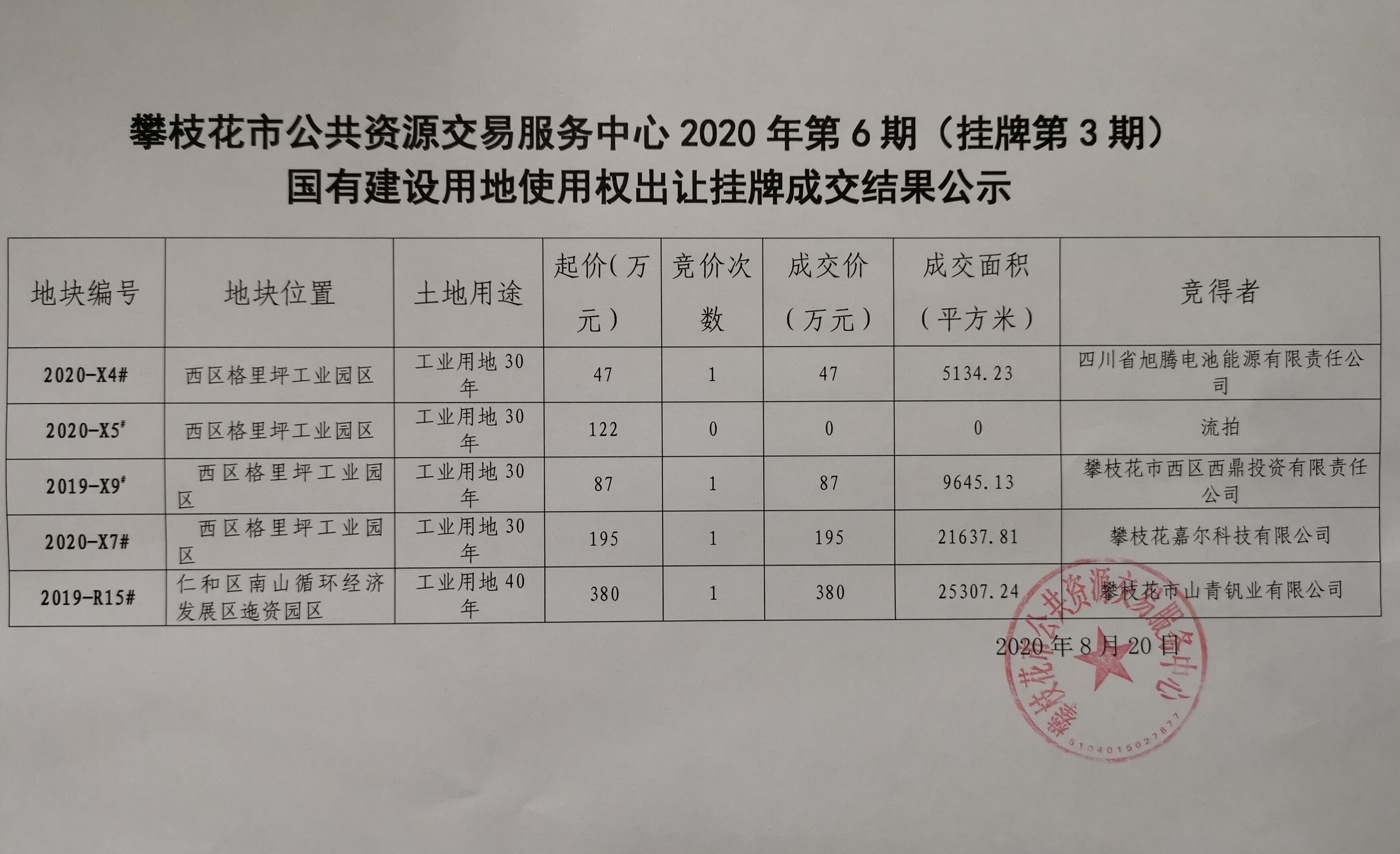 攀枝花市公共资源交易服务中心2020年第6期(挂牌第3期)国有建设用地使用权出让挂牌成交结果公示