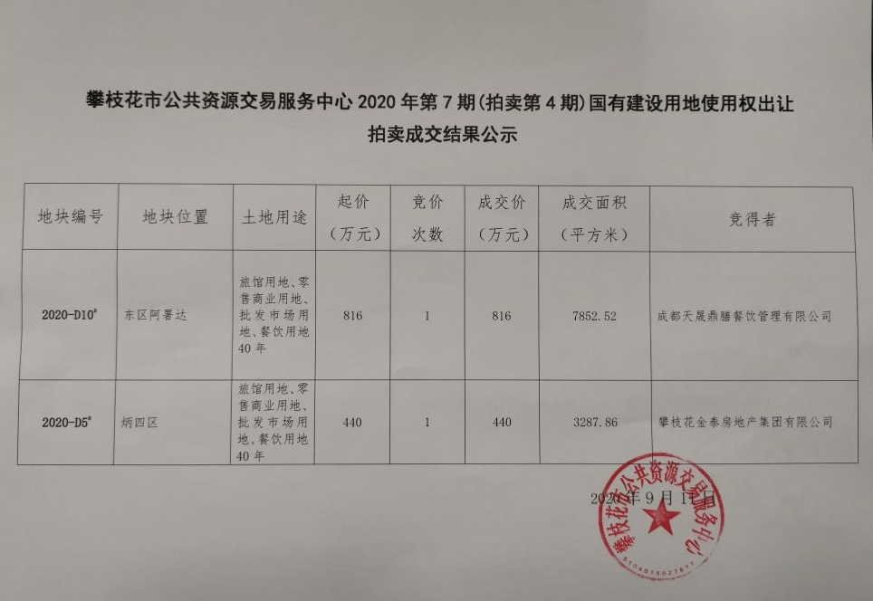 攀枝花市公共资源交易服务中心2020年第7期(拍卖第4期)国有建设用地使用权出让拍卖成交结果公示