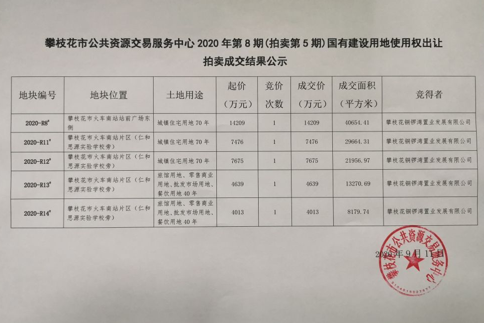 攀枝花市公共资源交易服务中心2020年第8期(拍卖第5期)国有建设用地使用权出让拍卖成交结果公示