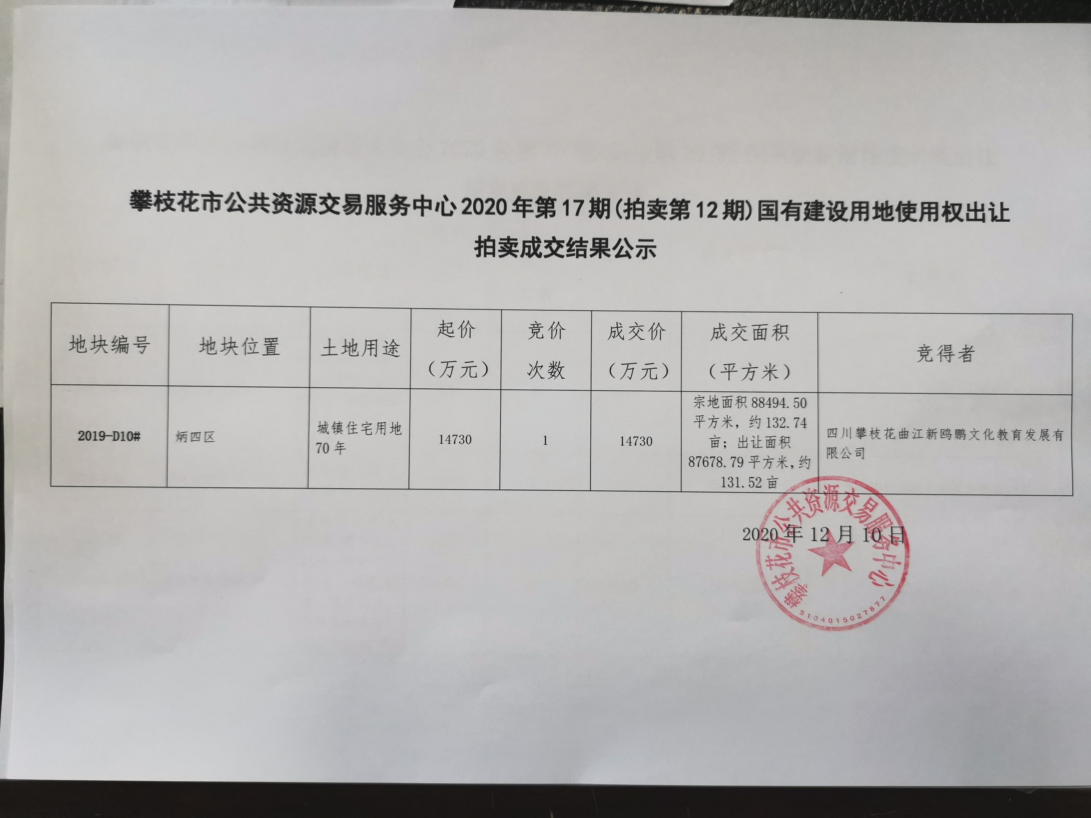 攀枝花市公共资源交易服务中心2020年第17期(拍卖第12期)国有建设用地使用权出让拍卖成交结果公示