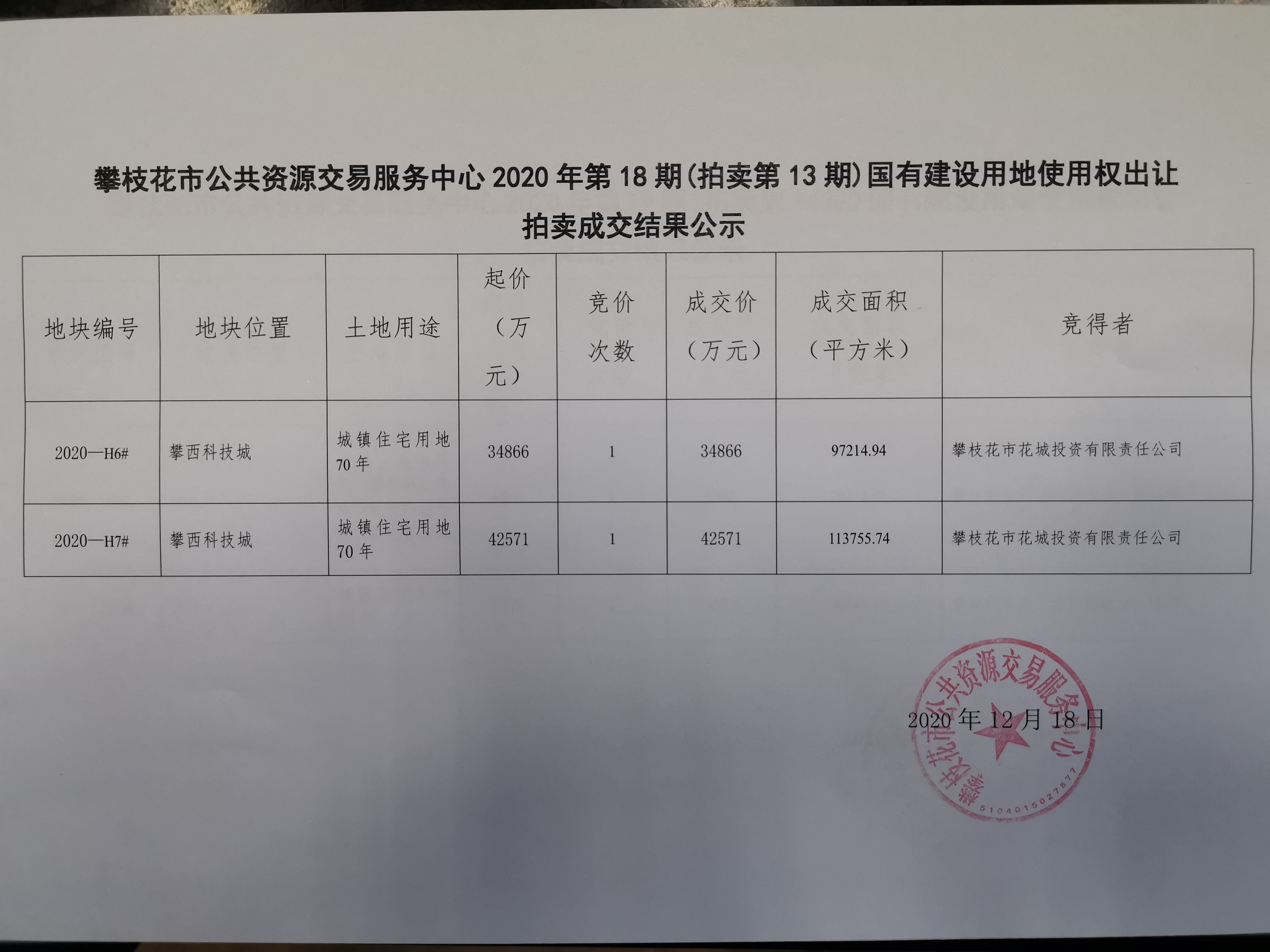 攀枝花市公共资源交易服务中心2020年第18期(拍卖第13期)国有建设用地使用权出让拍卖成交结果公示
