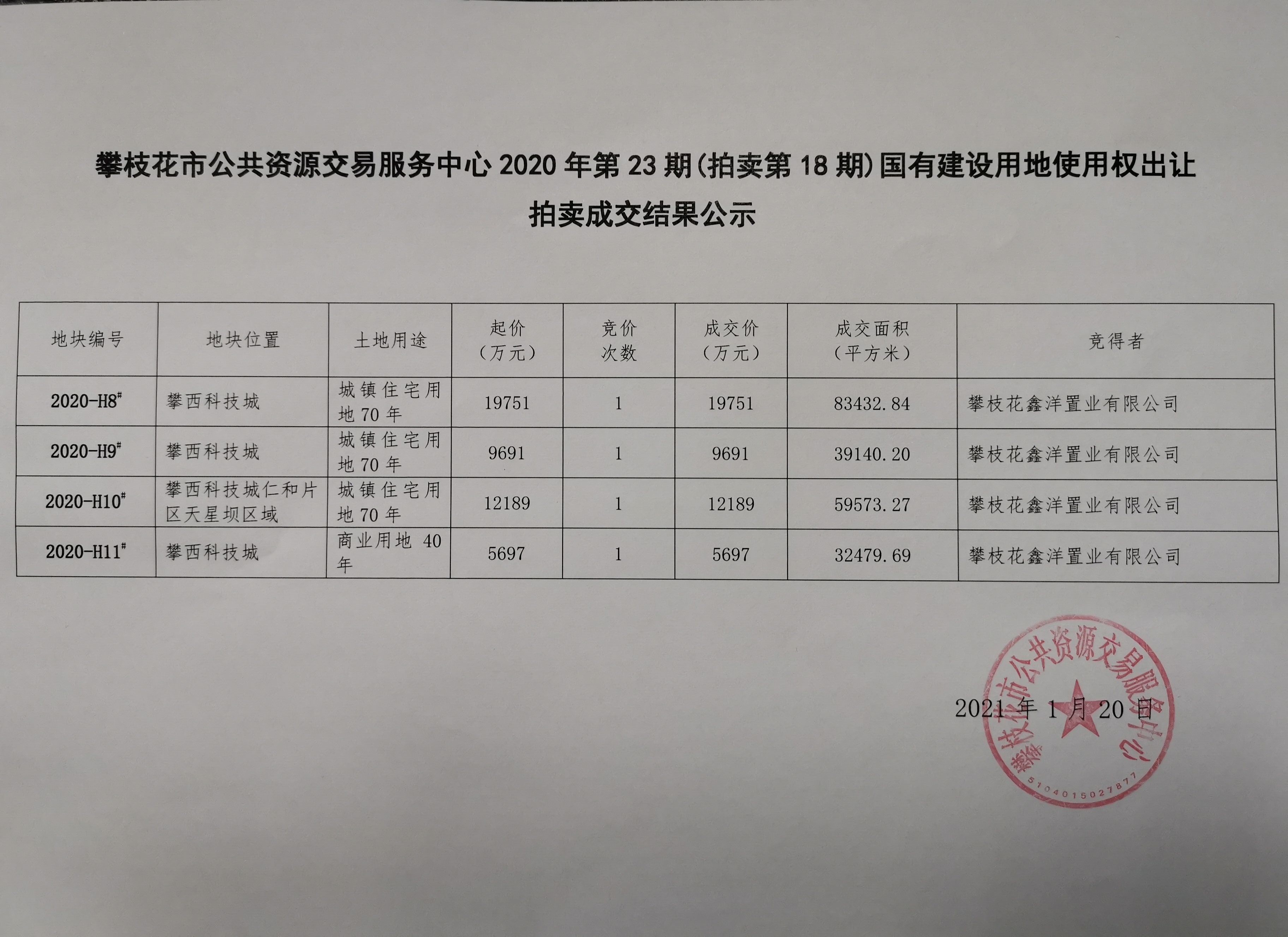 攀枝花市公共资源交易服务中心2020年第23期(拍卖第18期)国有建设用地使用权出让拍卖成交结果公示