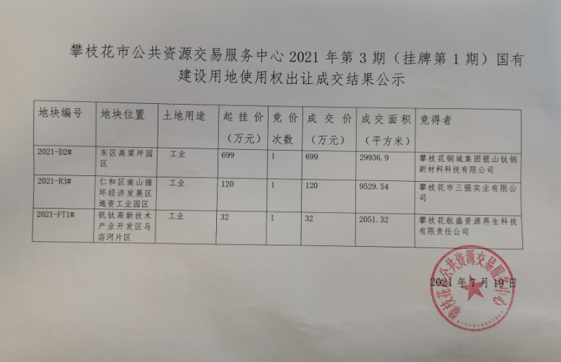 攀枝花市公共资源交易服务中心2021年第3期(挂牌第1期)国有建设用地使用权出让成交结果公示